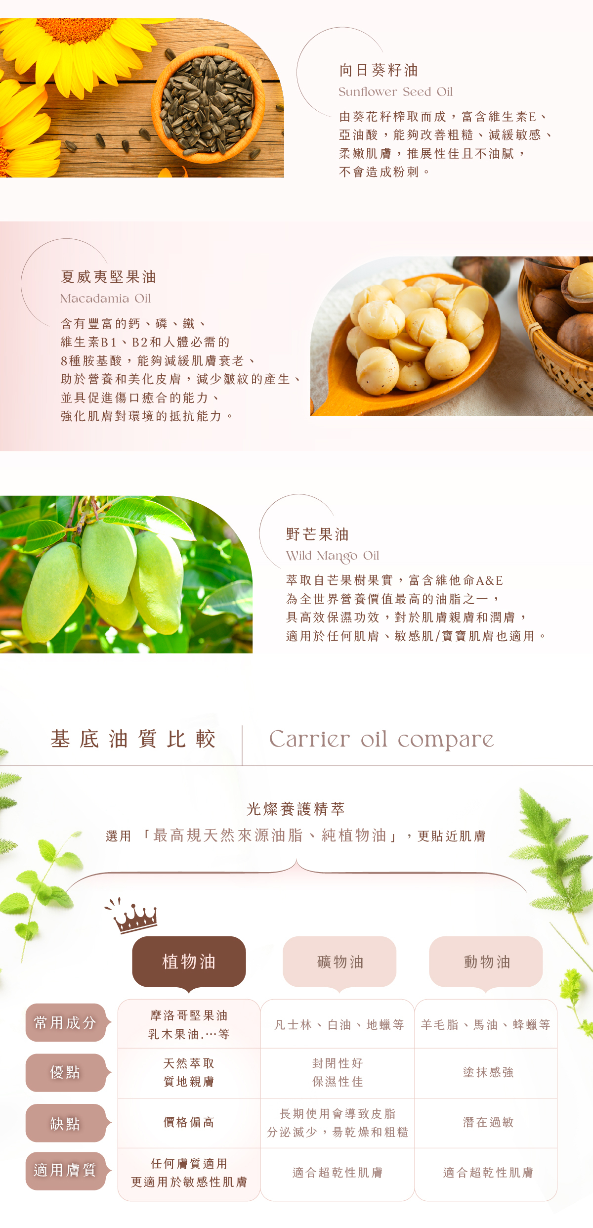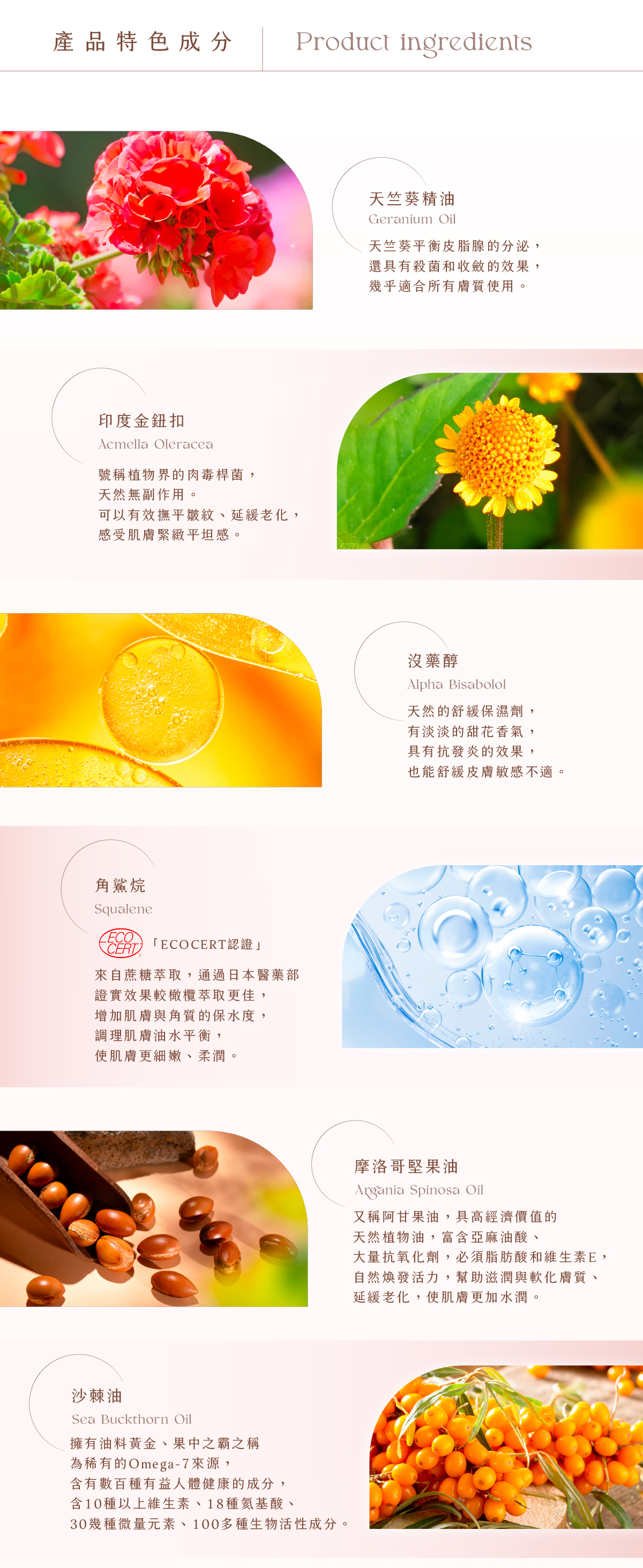 角鯊烷、印度金鈕釦、沙棘油、沒藥醇、向日葵籽油、天竺葵、也芒果油、夏威夷堅果油